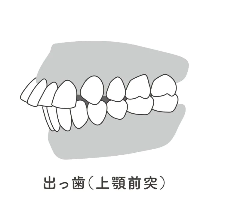 上顎前突(じょうがくぜんとつ)とは、下の歯よりも上の歯が前に大きく出た状態です。口を開けたときに目立つため、口元を隠したり人前で笑えなくなったりする方が少なくありません。上顎前突を改善すると、横顔を見たときの鼻から顎のバランス(Eライン)が整います。また、前歯の歯並びが悪いと、歯垢をすみずみまで磨き落とすことが難しいため、むし歯や歯周病のリスクが高まります。そのため、上顎前突を改善することは、むし歯や歯周病のリスクを抑えることに繋がります。